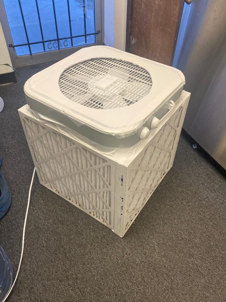 To illustrate this point we tested two air cleaners and compared the results. One of the air cleaners is an IQ Air. The other is a DIY Corsi/Rosenthal Box using MERV 13 filters.