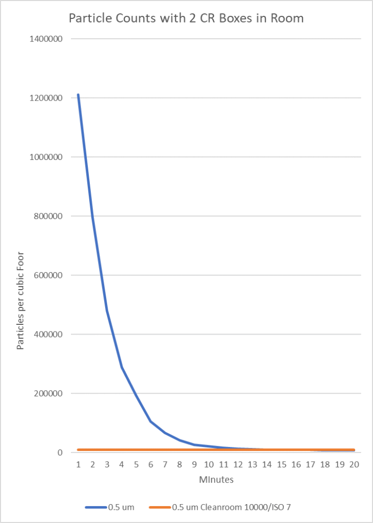 After 13 minutes, particles in the room reached cleanroom Class 10,000/ ISO 7 levels! Here is a graph showing the precipitous drop in 0.5 um particles. It is impressive.