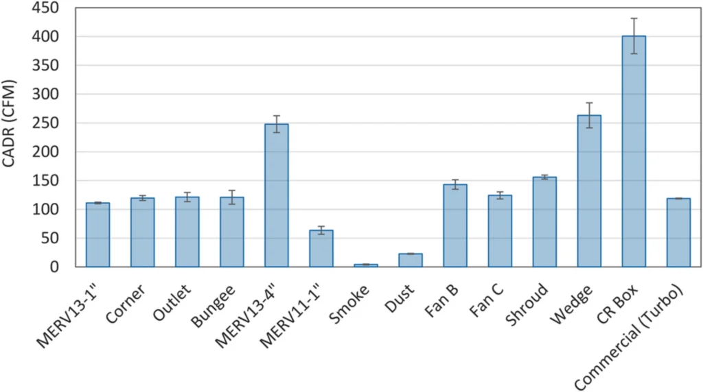 The results are consistent with other studies and show that the DIY air cleaners using MERV 13 filters with the highest level of air filter media produce the best results. The Corsi-Rosenthal Box (CR Box) had a CADR of 400 CFM followed by the “wedge design” using two filters with a CADR of 270 CFM and the unit using a 4″ MERV 13 filter with a CADR of 250 CFM. It is interesting to note that the addition of the “shroud” to the 1-filter design increased the CADR by approximately 40%. It is also interesting that the Commercial HEPA (Turbo) had about the same CADR as the 1″ MERV13 filter on a box fan.